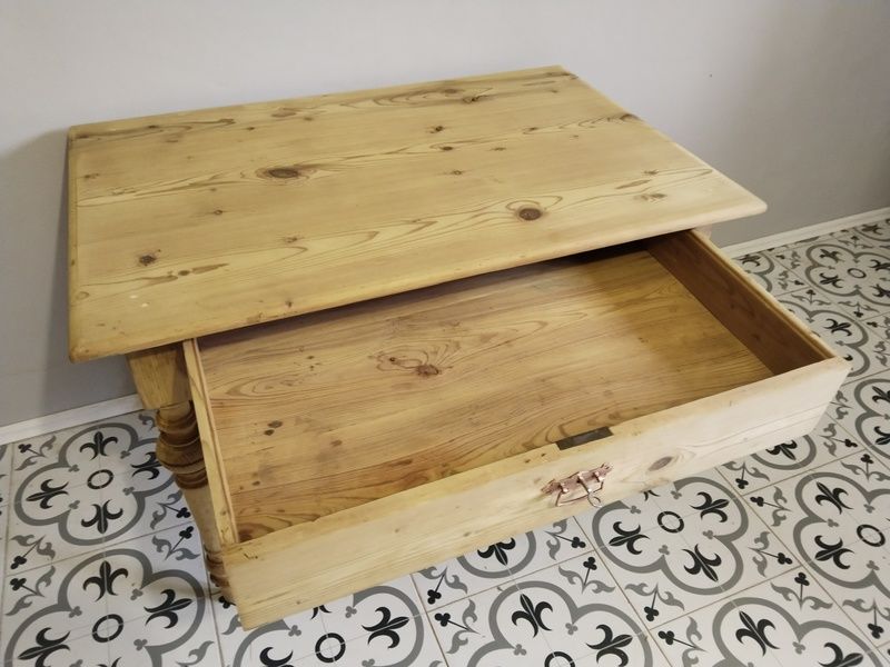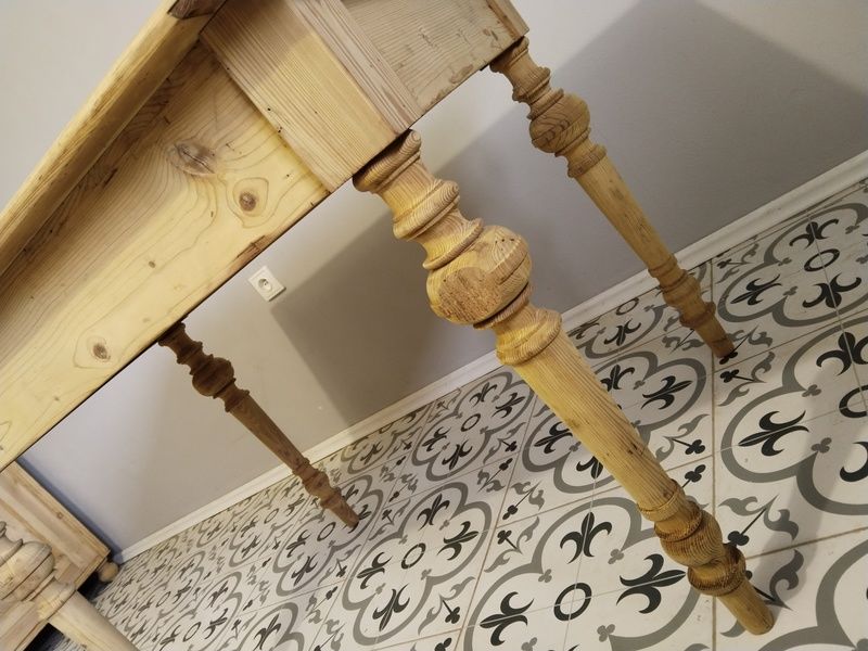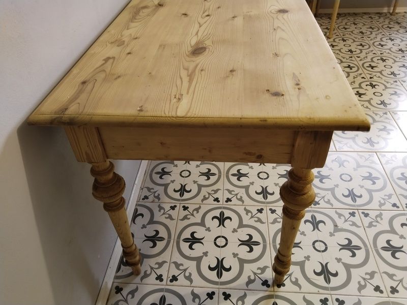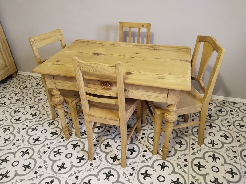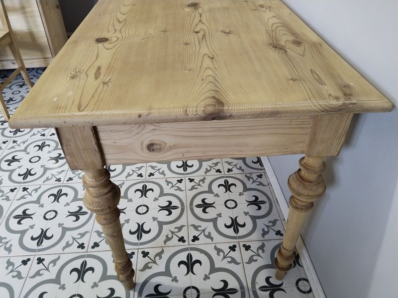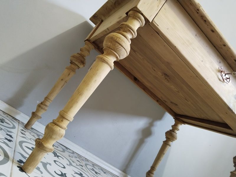 Větší, starý stůl se soustruženýma nohama po renovaci. Je olouhovaný, obroušený a zatím bez povrchové úpravy čisté dřevo. Rozměry v. 78 cm, deska 111 * 73 cm.