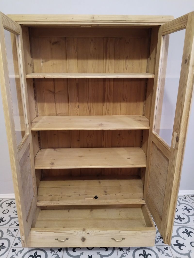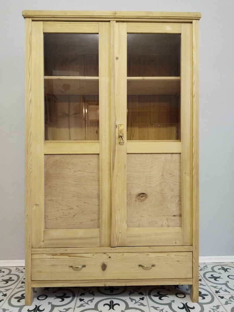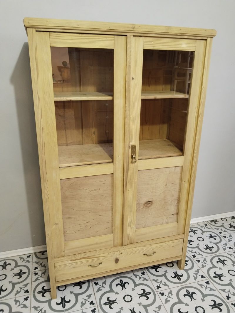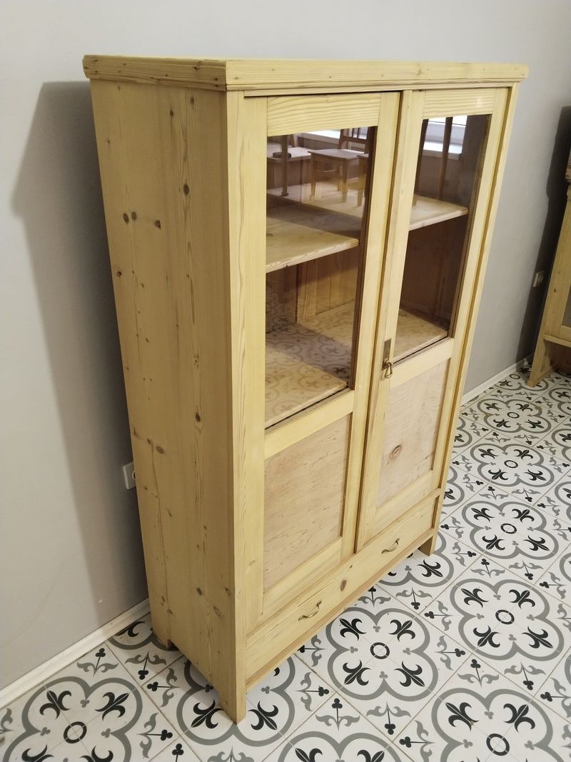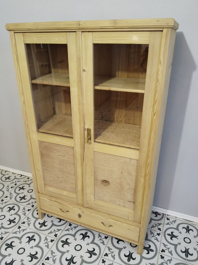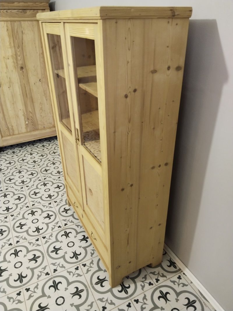 Stará, tříčtvrteční skříň po renovaci. Je olouhovaná, obroušená a zatím bez povrchové úpravy čisté dřevo. Rozměry v. 161 cm, š. 97 cm, h. 42 cm.
