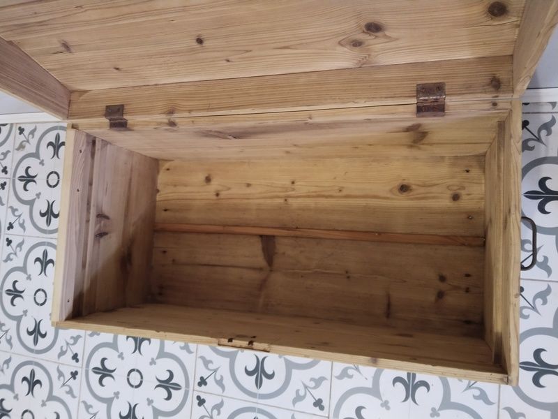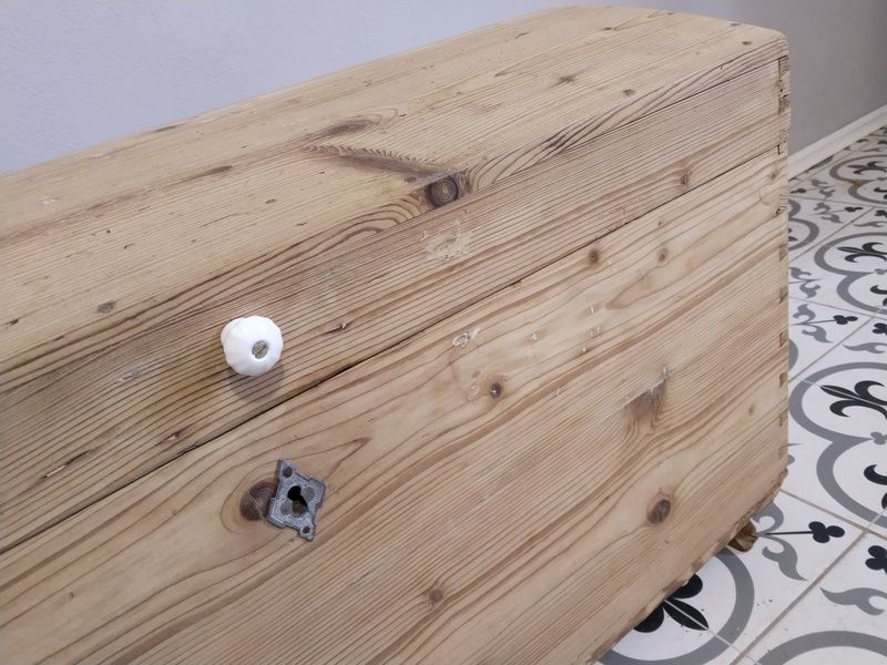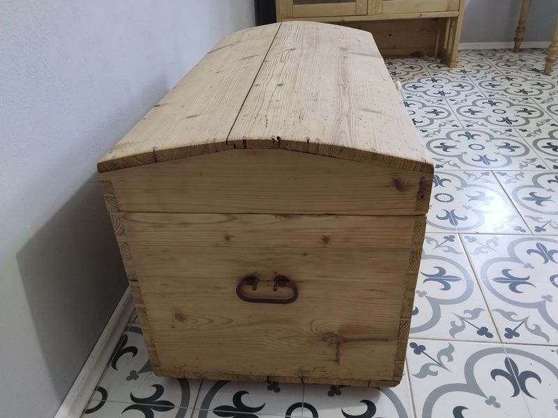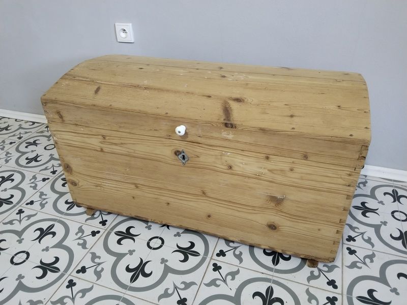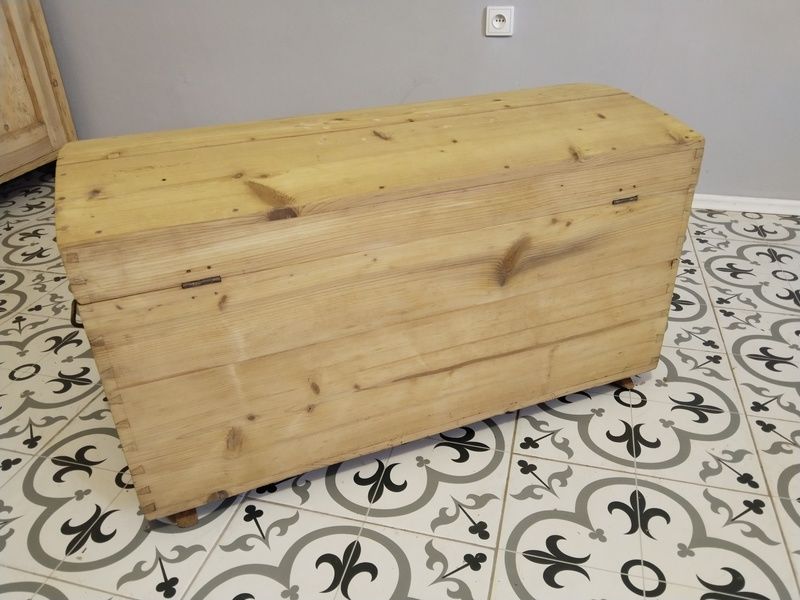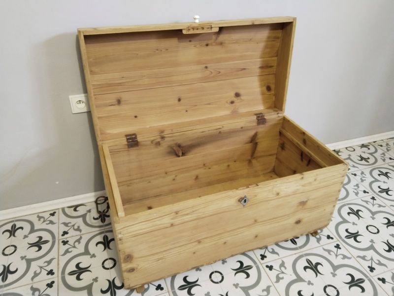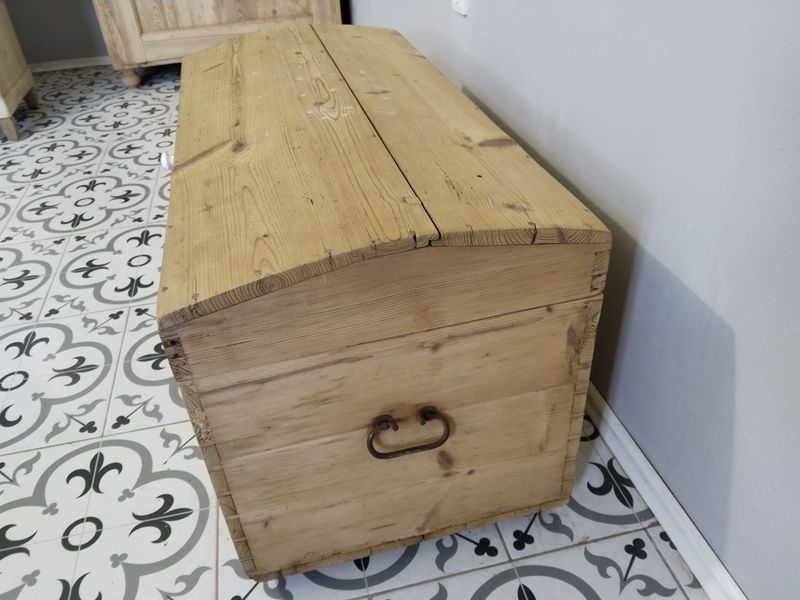 Starý kufr po renovaci. Kufr je olouhovaný, obroušený a zatím bez povrchové úpravy čisté dřevo. Rozměr d. 93 cm , h . 46 cm , v. 52 cm.
