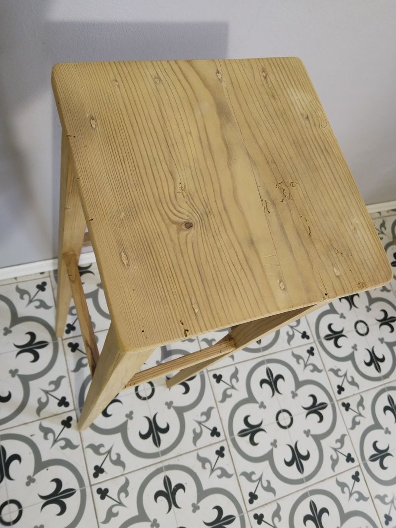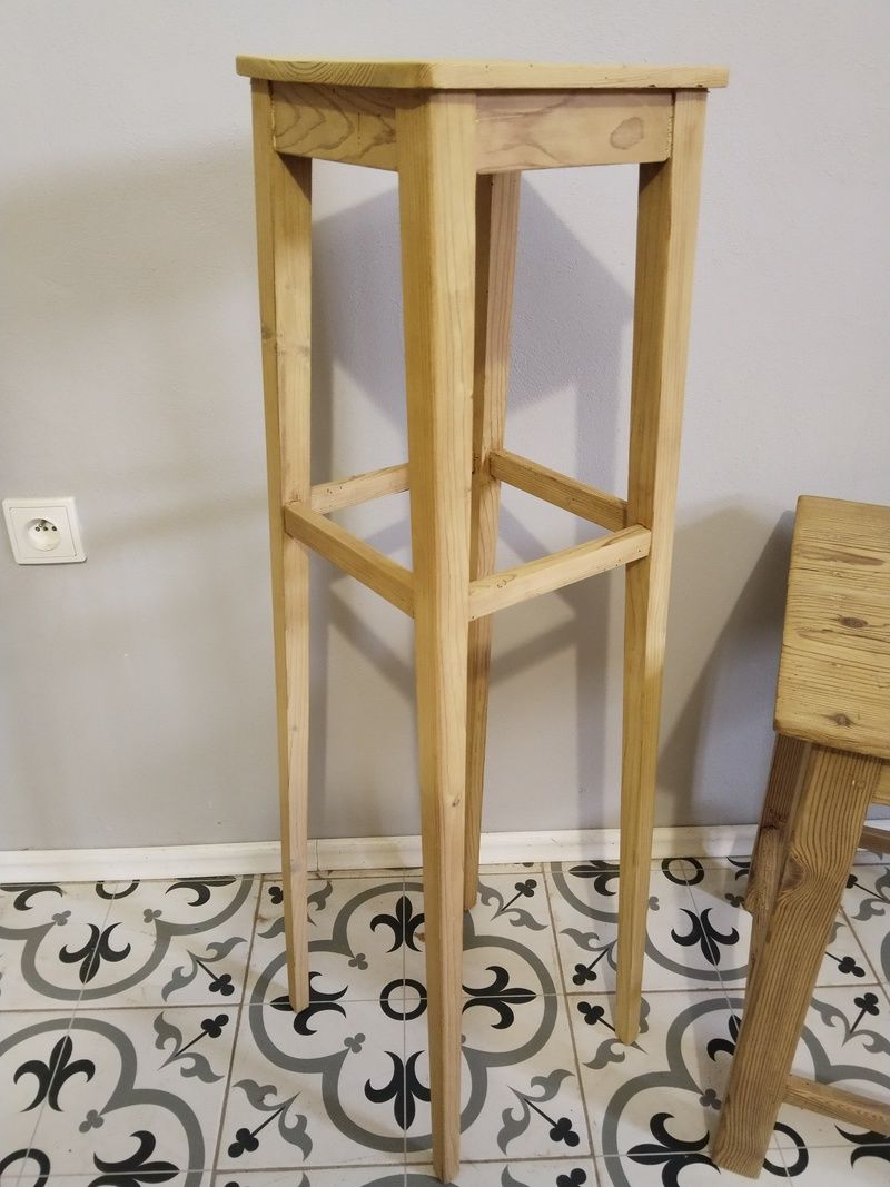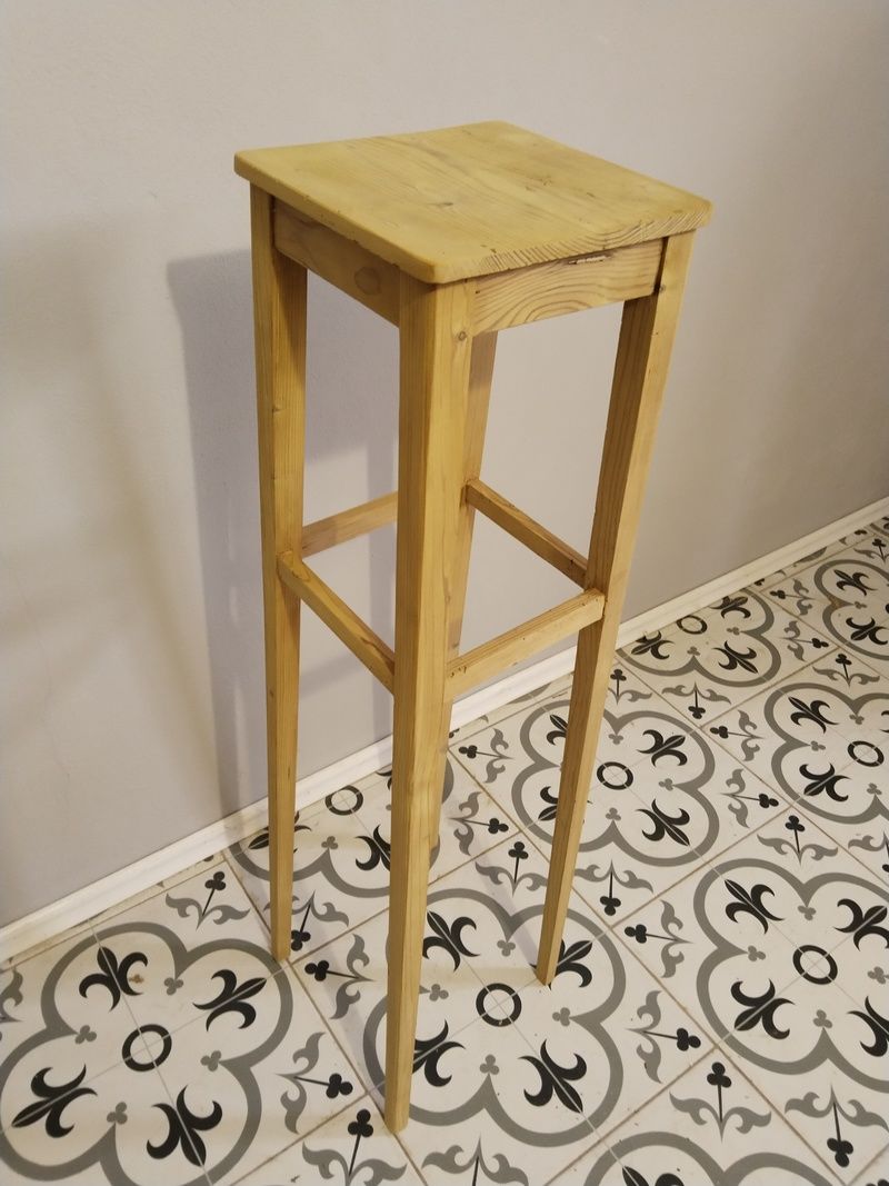 Starý květinový stolek po renovaci. Je olouhovaný, obroušený a zatím bez povrchové úpravy čisté dřevo. Rozměry v. 101 cm, vrchní deska 25 * 25 cm.