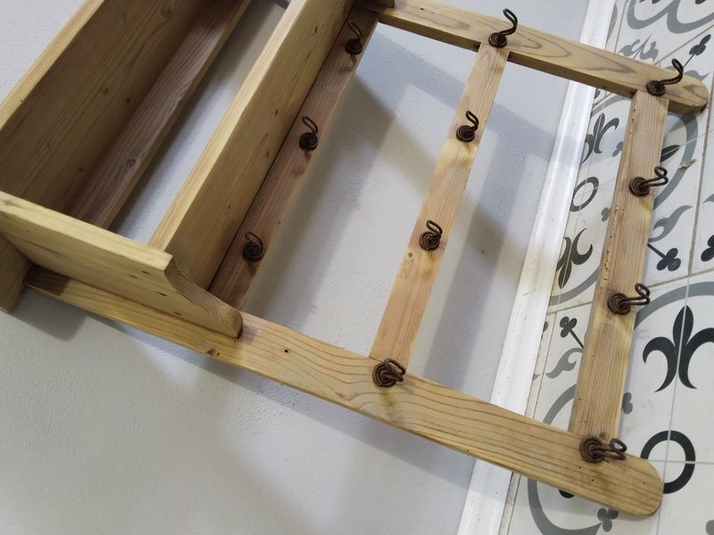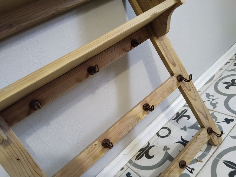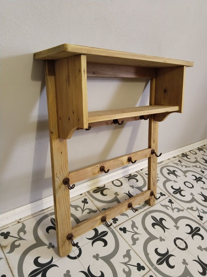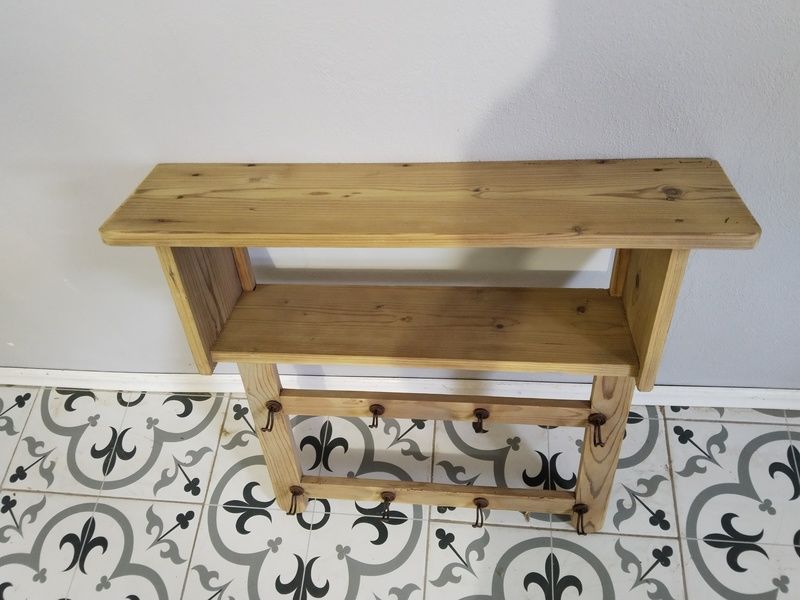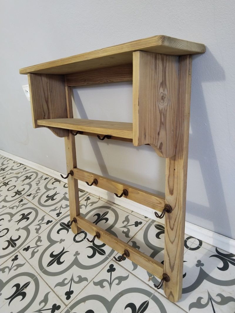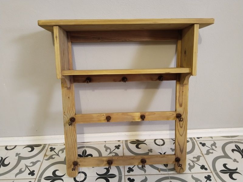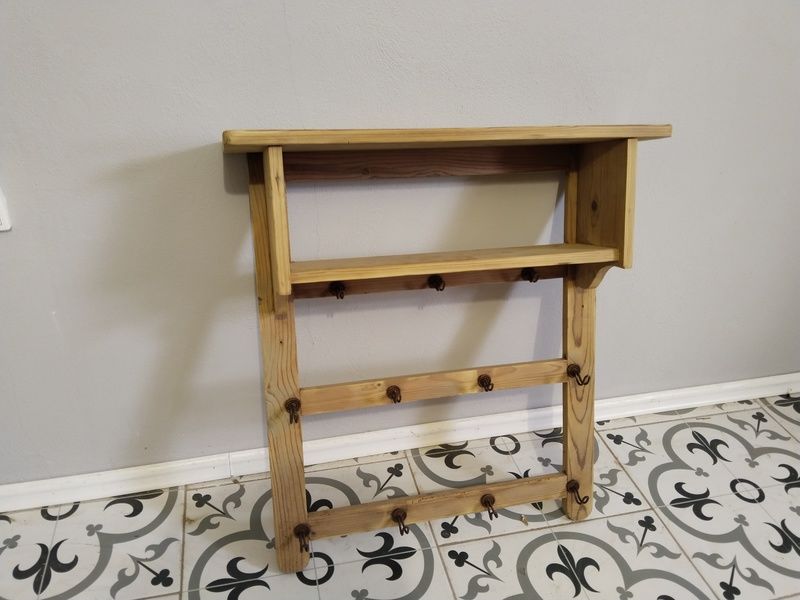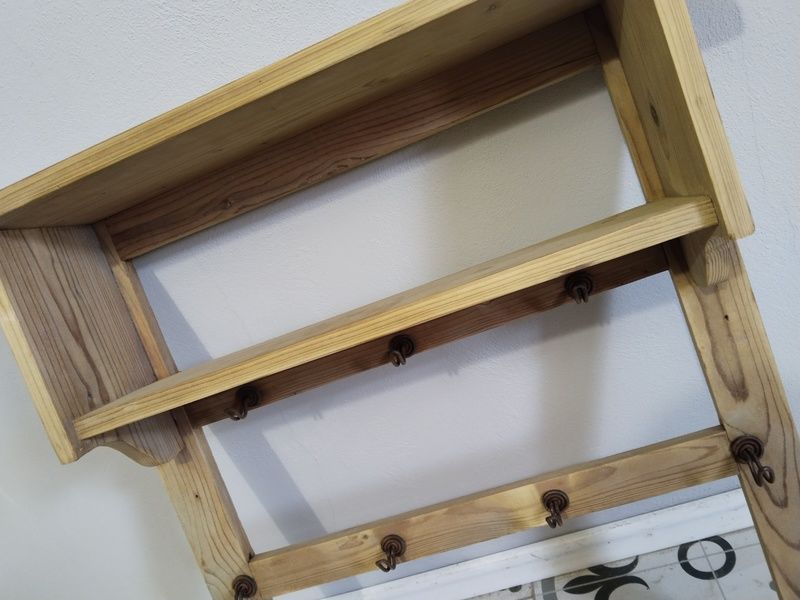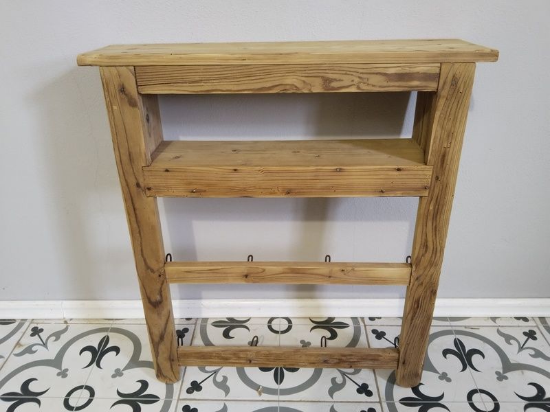 Stará polička po renovaci. Je olouhovaná, obroušená a zatím bez povrchové úpravy čisté dřevo. Rozměry v. 65 cm, š. 60 cm, h. 15 cm.