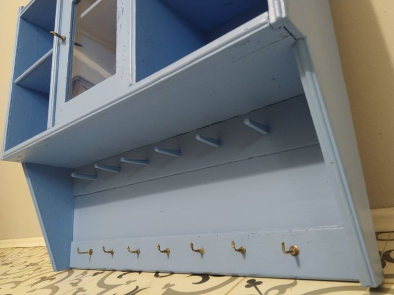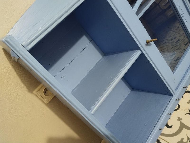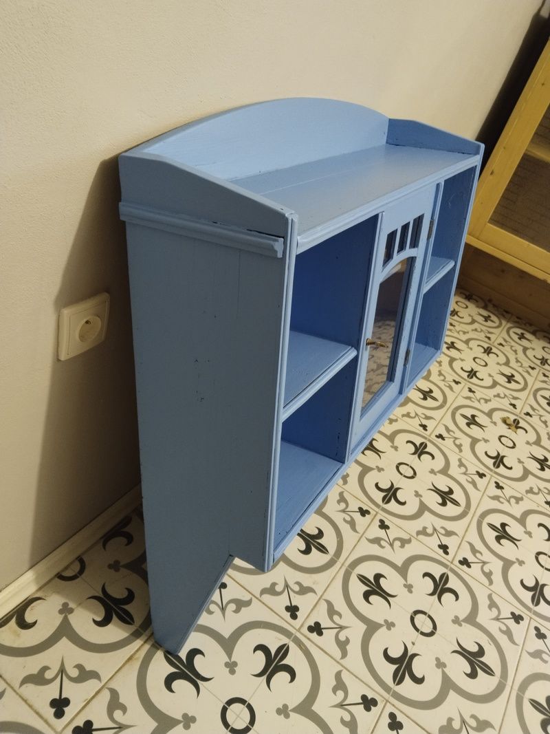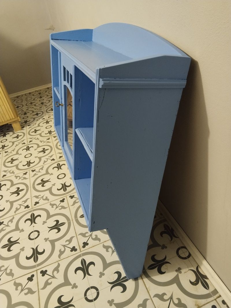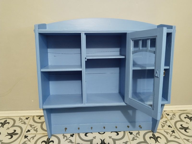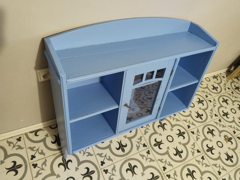 Stará polička po renovaci. Je olouhovaná, obroušená a natřená modrou barvou. Rozměry v. 86 cm, š. 83 cm, h. 23 cm.