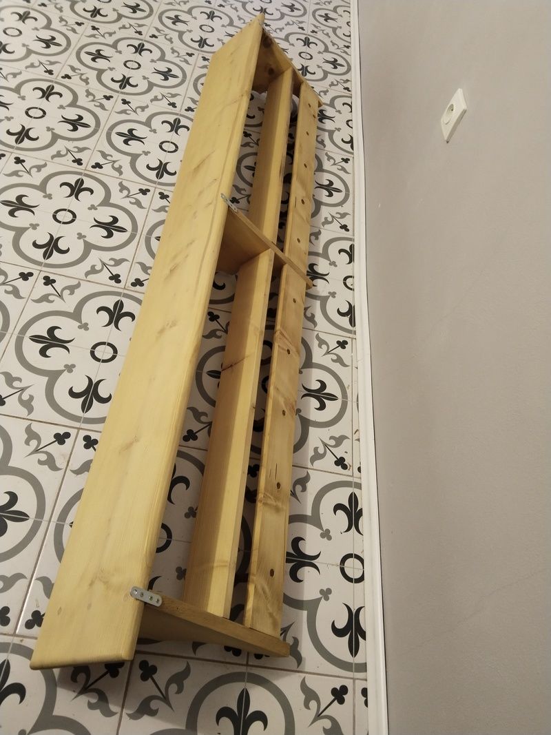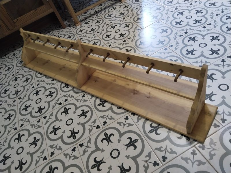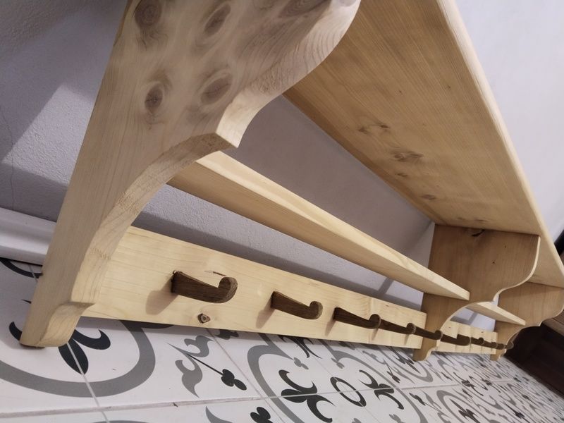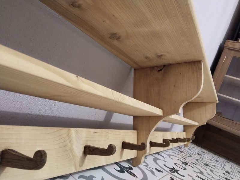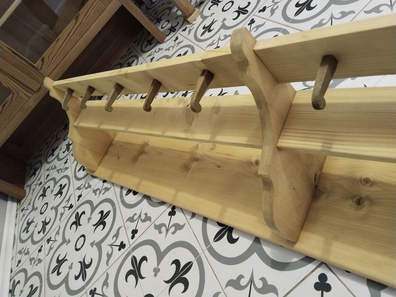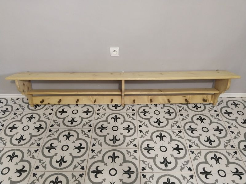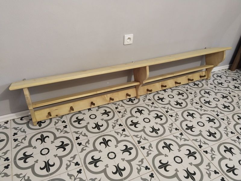 Velká, dlouhá, selská police. Je nově vyrobená podle starého vzoru. Bez povrchové úpravy čisté dřevo. Rozměry d. 197 cm, h. 24 cm, v. 35 cm.
